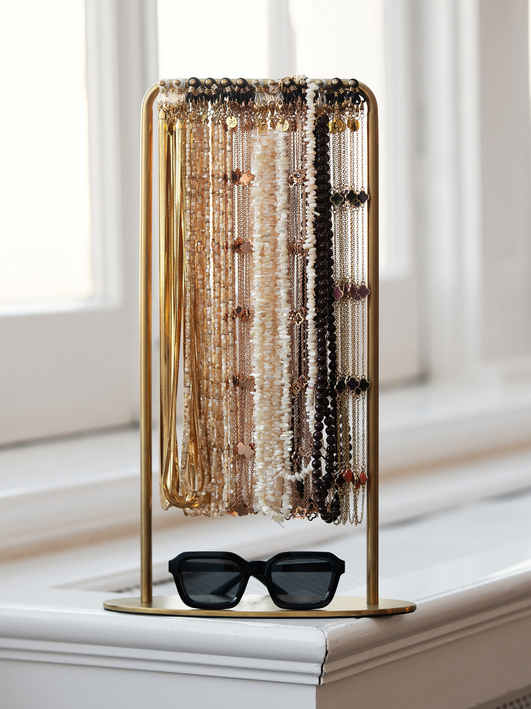 This Sunny Cords display stand is a new design that shows elegance. Made from gold-colored metal, it offers a stylish way to showcase your eyewear chains.