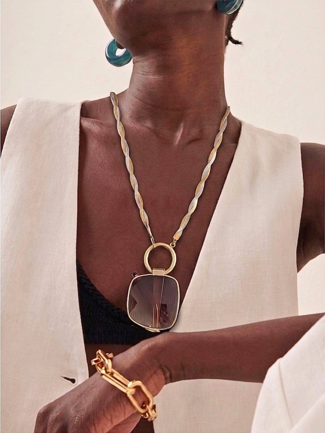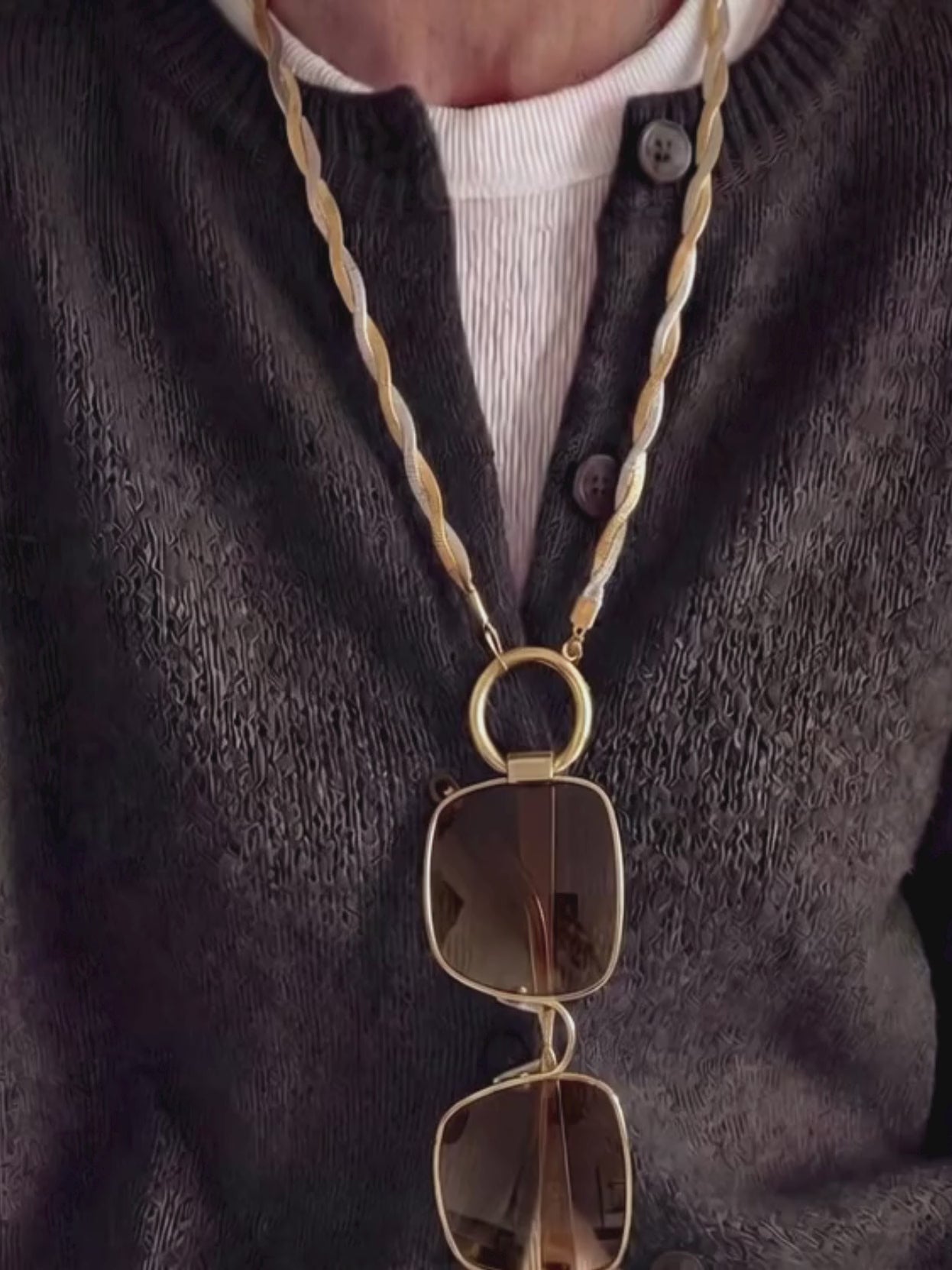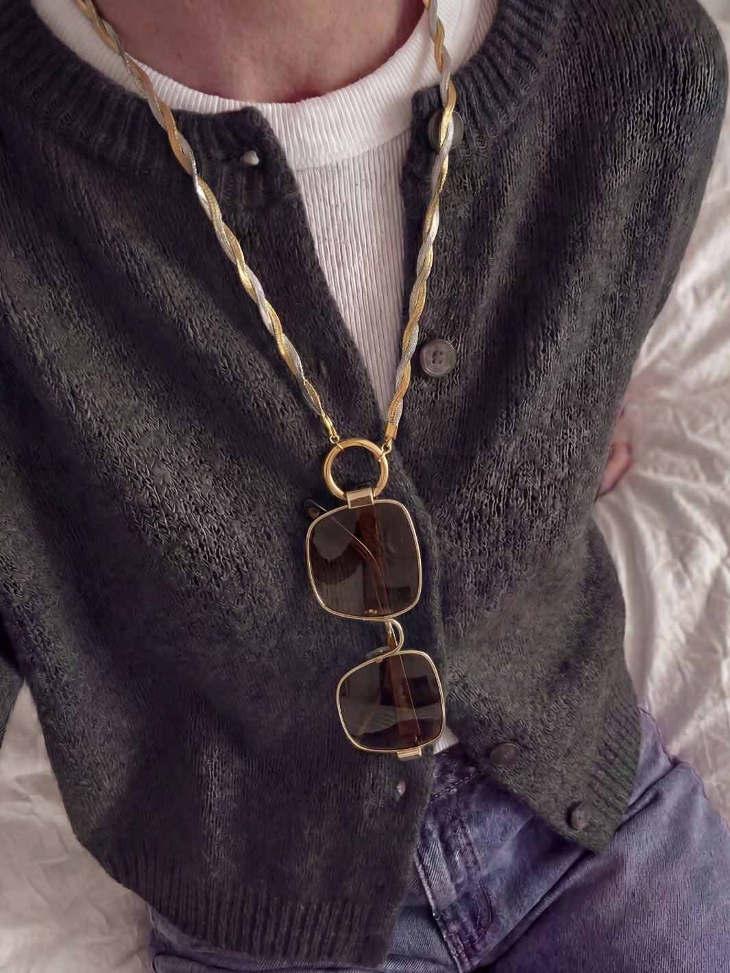 Bring a fresh twist to your style with the Braided Jane silver-gold eyewear holder necklace. This sunglass chain is reimagined as a necklace within our Ring Edit collection. It blends 18K gold- and silver-plated details into a braided texture that adds depth without feeling heavy. A go-to when you want something simple, but not basic. Prefer all gold? Go for Braided Jane Gold.