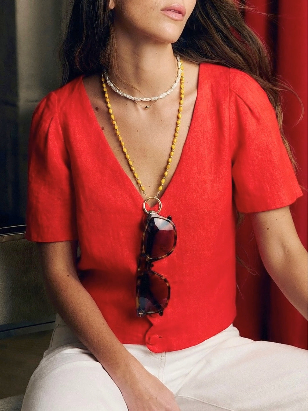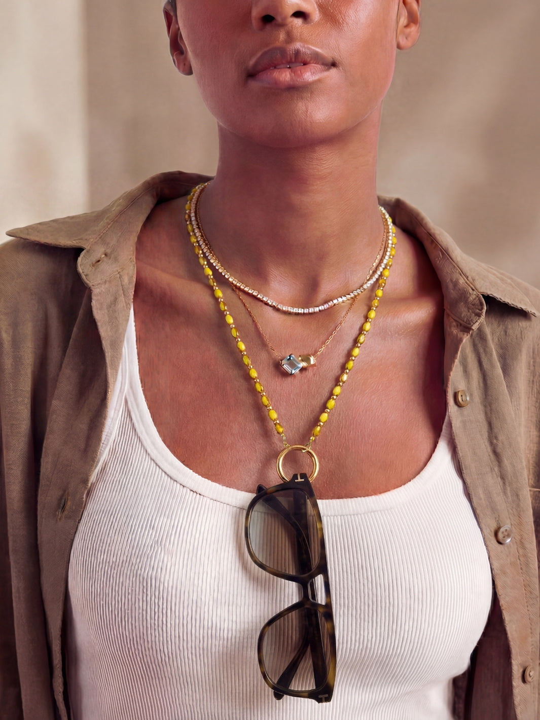 Add warmth to your look with the Sam Yellow multifunctional necklace. This eyewear chain is reimagined as a necklace within our Ring Edit collection. It brings soft yellow tones together with gold, instantly adding energy to your look without feeling too bold. A perfect piece to tap into the butter yellow trend. Prefer something cooler? Choose our Blue variant.